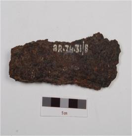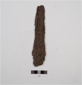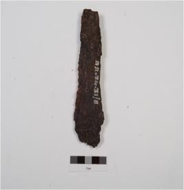 | Description / विवरण | Fragment of an iron knife with rusted surface, flattened along the edges, broken at one end. |