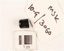| Description / विवरण | A small cylindrical glass bead black in colour, circular cross section, polished and perforated. |