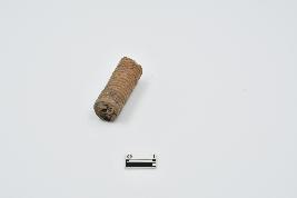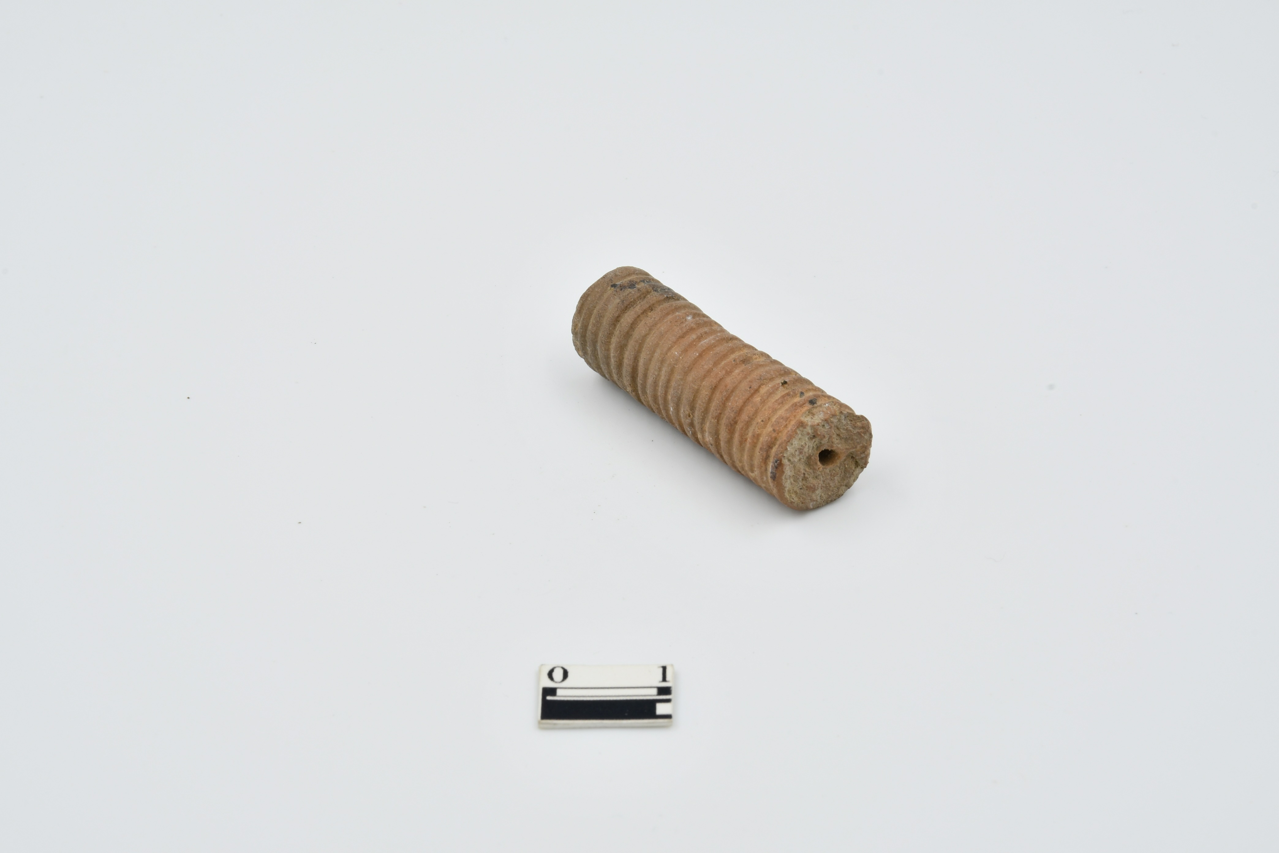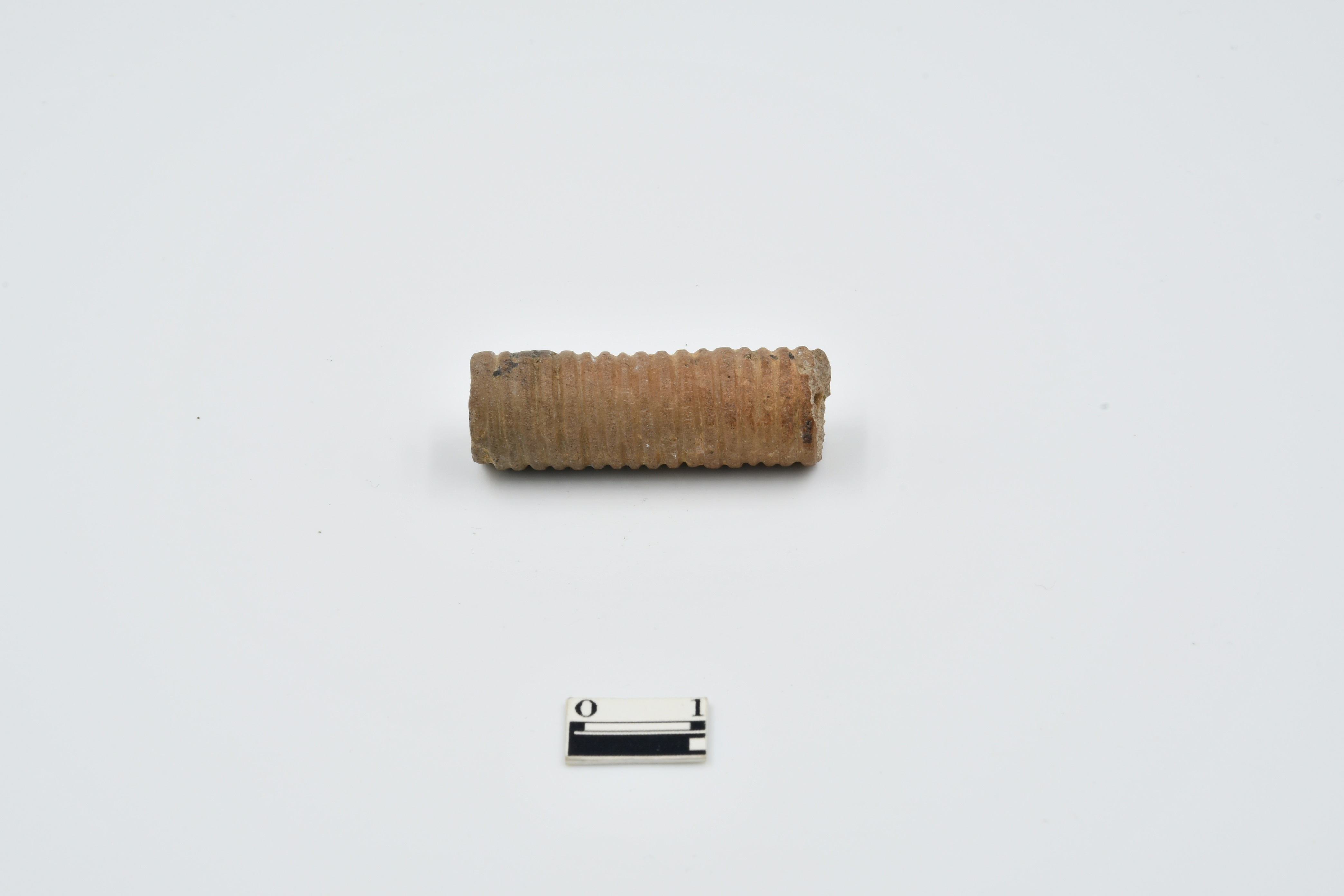 Cylindrical shape terracotta bead, Broken from one end, spiral grooves design on surface