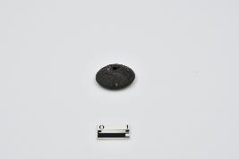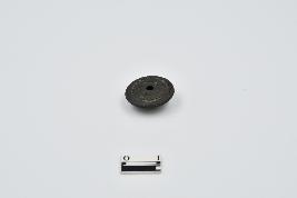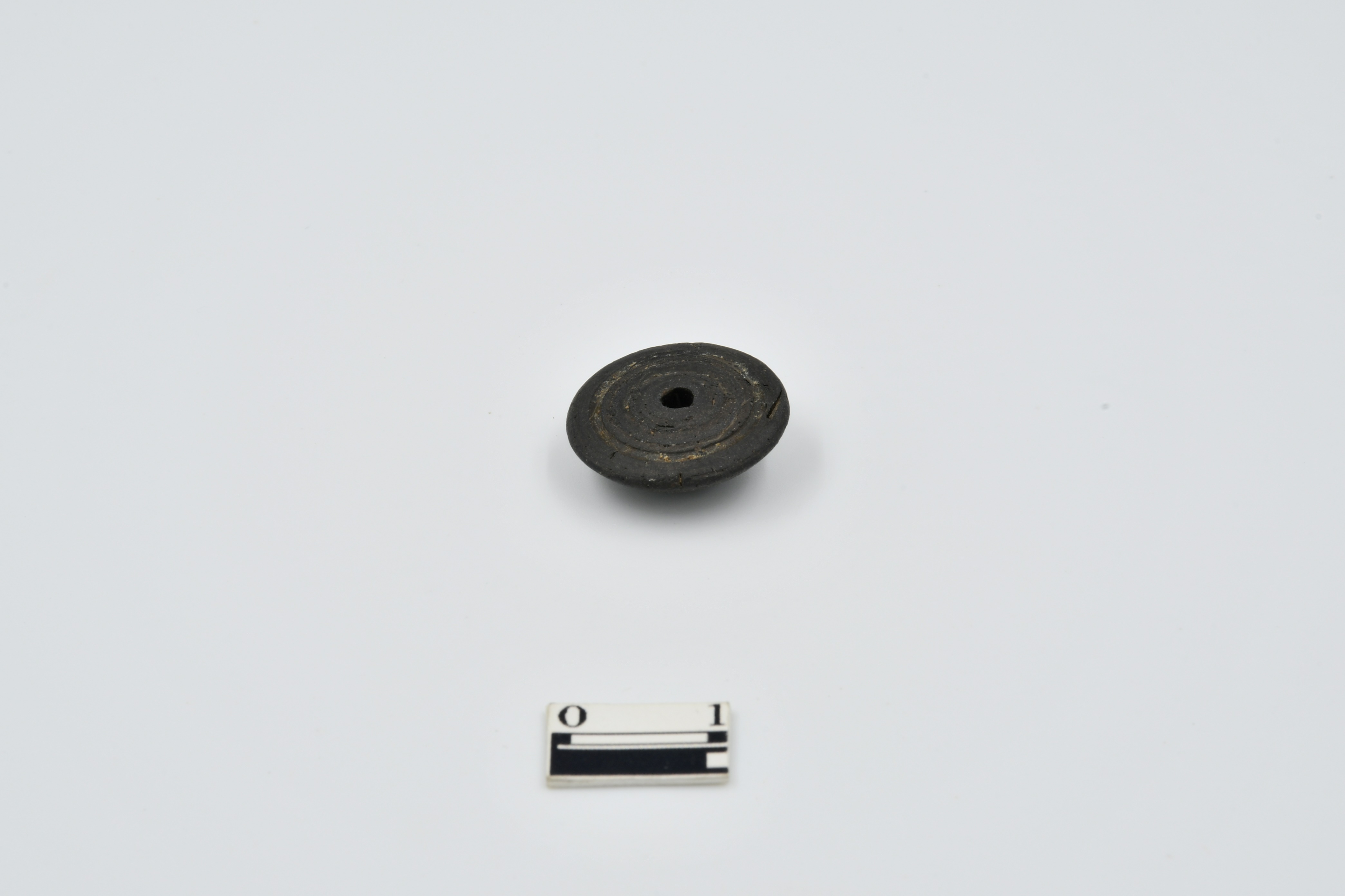 Short truncated terracotta areca-nut shape bead. black in color, groove on bottom