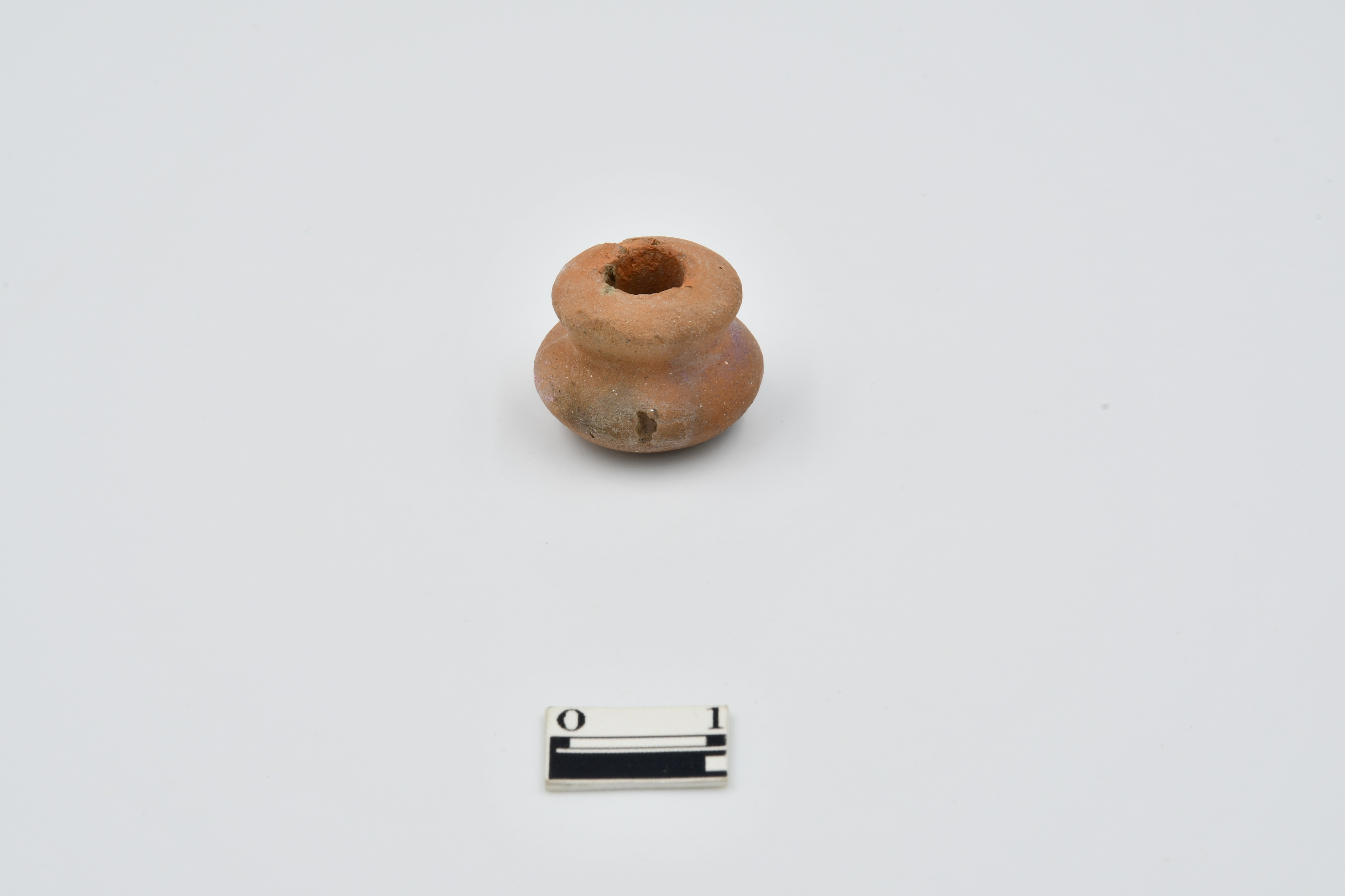 Ghat shape terracotta bead. chipped from surface and top of bead