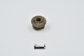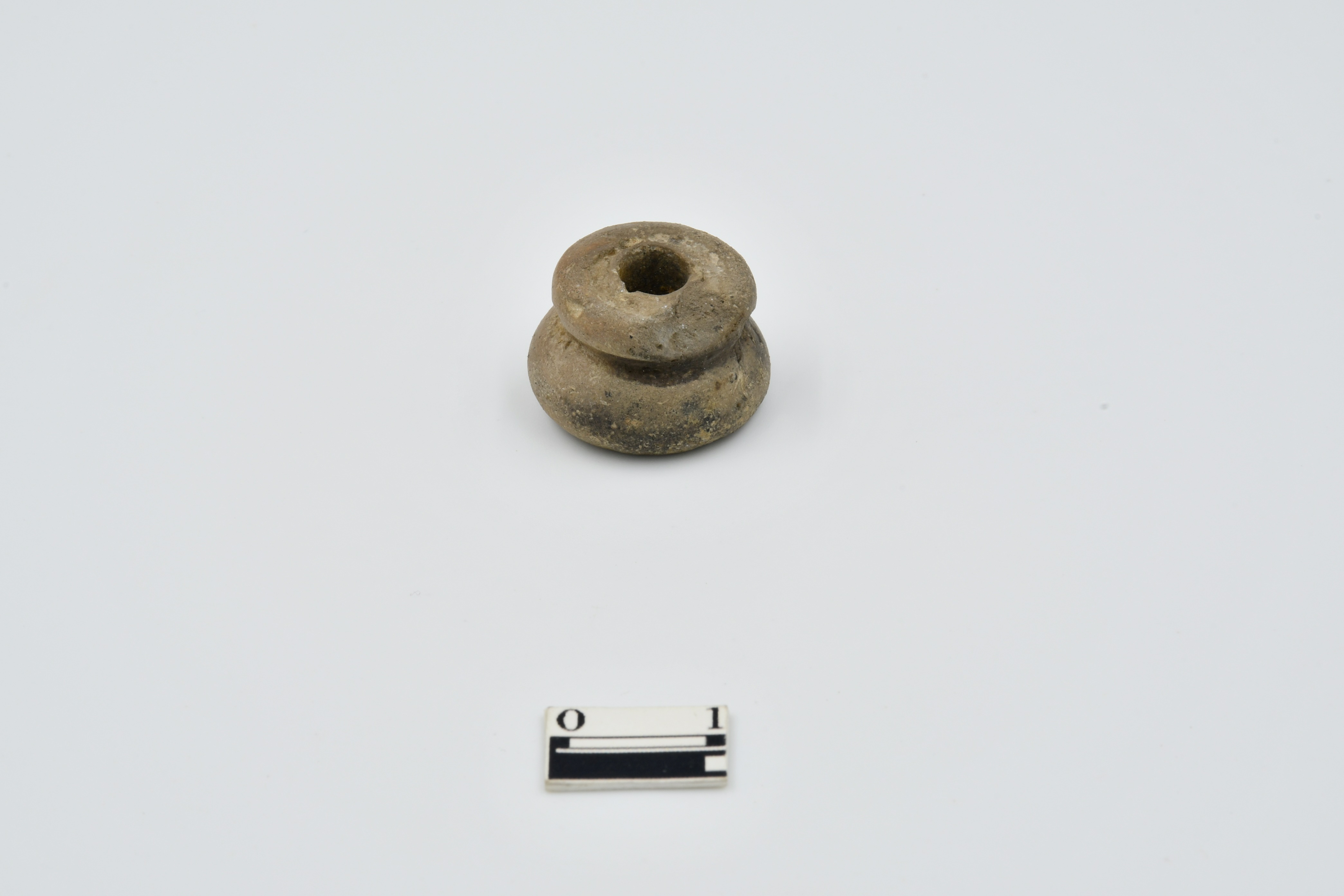 Ghat shape terracotta bead. Partially broken on top, rough surface with fine perforation