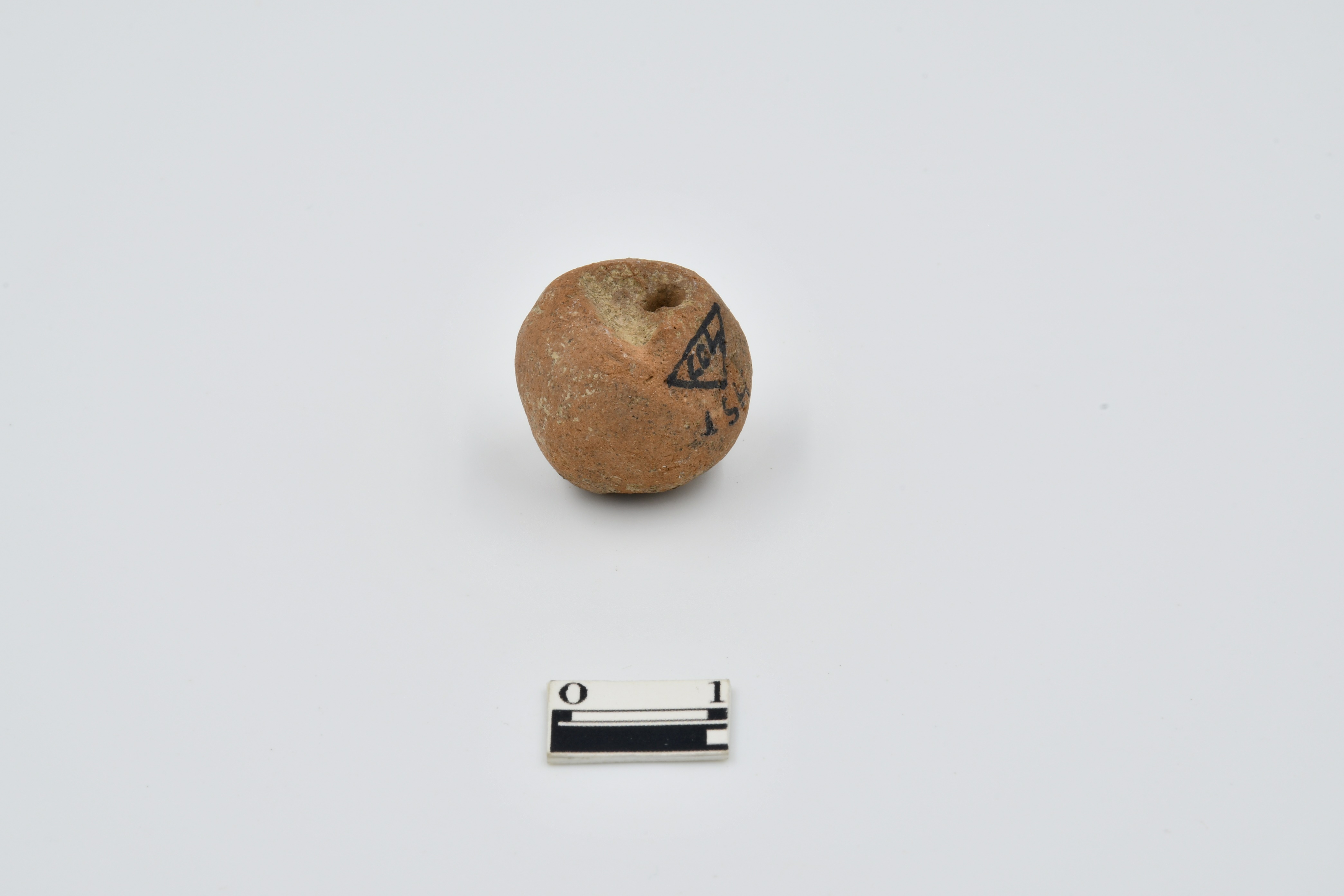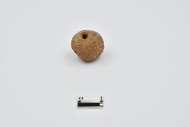 Spherical shape terracotta bead, broken at one end, rough surface.