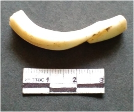 | Description / विवरण | It is a shell bangle fragment. Finished and polished, broken. Decorated with chevron mark on the surface. Whitish in color. Triangular in section with flat edges. |