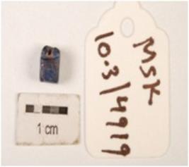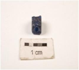 | Description / विवरण | Small cube shaped lapis-lazuli bead, perforated, chipped off from top, pink band on surface, proper edges, blue in colour. |