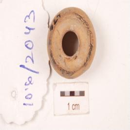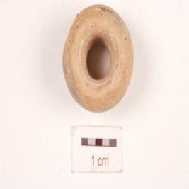 | Description / विवरण | A handmade terracotta bead, ghat like shape, circular in section, transverse perforation, well baked, surface treated with dull red slip. |