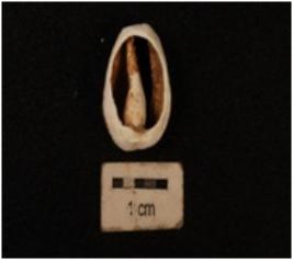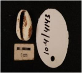 | Description / विवरण | A small shell cowrie, a natural marine object with groove, powdery surface, natural white colour and exterior surface broken. |