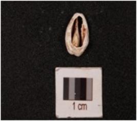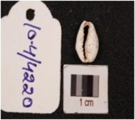 | Description / विवरण | A cowrie shell with natural groove at the base, powdery surface, white in colour and damage in the exterior. |