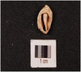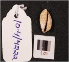 | Description / विवरण | A cowrie shell with natural groove at the base, powdery surface, white in colour and damage in the exterior. |