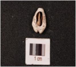 | Description / विवरण | A cowrie shell with natural groove at the base, powdery surface, white in colour and damaged in the exterior. |