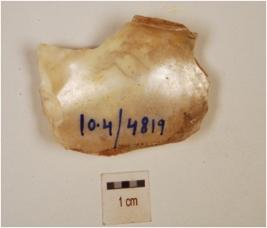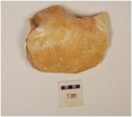 | Description / विवरण | A fragment of muscle curved, uneven edges, hollow and glossy inside. |