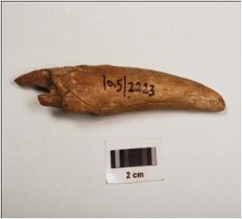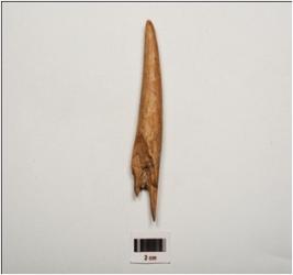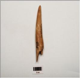| Description / विवरण | A horn core, polished surface with crack marks, pointed at one end, partly broken from other end and brown in colour |