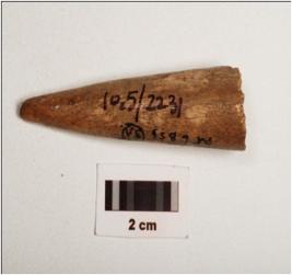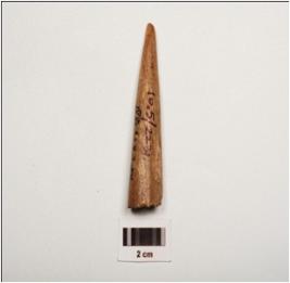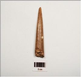 | Description / विवरण | A horn core, polished surface with vertical crack marks, pointed at one end, partly broken at other end, hollow from within and dark brown in colour. |
