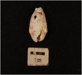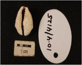 | Description / विवरण | A small shell cowrie, a natural marine object with groove, powdery surface and natural white colour. |