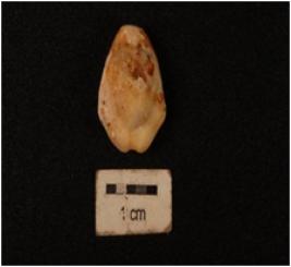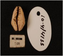 | Description / विवरण | A small shell cowrie, a natural marine object with groove, powdery surface and natural white colour. |