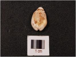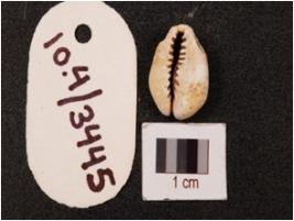 | Description / विवरण | Cowrie shell, natural marine object with grooved line and powdery surface. |