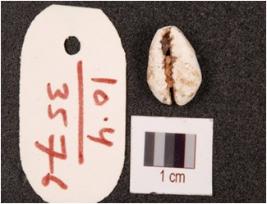 | Description / विवरण | Cowrie shell, natural marine object with powdery surface and natural groove. |