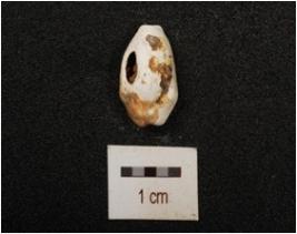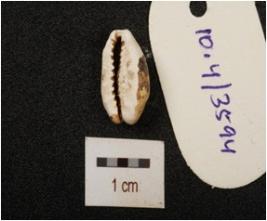 | Description / विवरण | Cowrie shell with powdery and small hole on surface, natural groove line at bottom and brown patches on surface. |