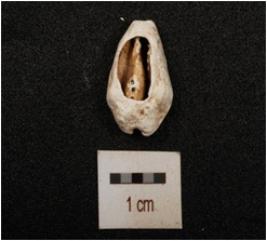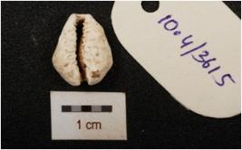 | Description / विवरण | Cowrie shell with partly broken powdery surface, natural groove line at bottom and white in colour. |