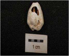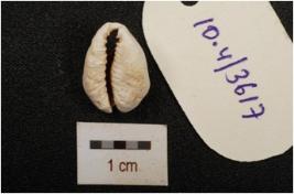 | Description / विवरण | Cowrie, shell object with partly broken and powdery surface, natural groove line at bottom and white in colour. |
