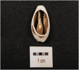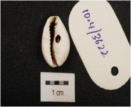 | Description / विवरण | Cowrie, natural marine shell object with powdery and partly broken surface, natural groove line at bottom with a hole and white in colour. |