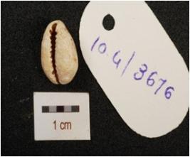 Description / विवरण | Cowrie, flaked off, bulbous and powdery surface with a natural groove at bottom and cream in colour. |