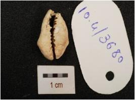 | Description / विवरण | Cowrie, partly broken powdery surface, flaked off, natural groove at base and cream in colour. |