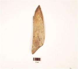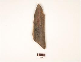 | Description / विवरण | A fragment of bone object, indetermiante, flat surface, uneven in shape, pointed end, black in colour, chipped off from edges and thin in character. |