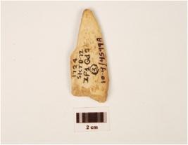 | Description / विवरण | A fragment of bone object, U shaped top, partly broken, hollow inside, irregular edges, off white in colour and polished. |