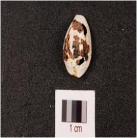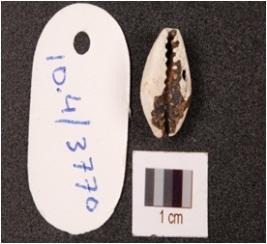 | Description / विवरण | A cowrie shell with partly damaged surface, natural groove at the base and off white in colour. |