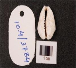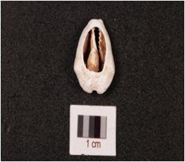 | Description / विवरण | A cowrie shell with partly damaged top, natural groove at the base, powdery surface and white in colour. |
