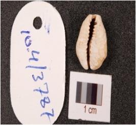 | Description / विवरण | A cowrie shell with bulbous top, natural groove at the base, powdery surface and cream in colour. |