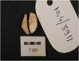 | Description / विवरण | Cowrie shell, natural grooves on surface of the body, damaged exterior surface, marine origin. |