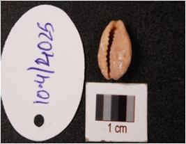 | Description / विवरण | A cowrie shell, natural marine object with natural groove, white in colour and hole on the exterior. |