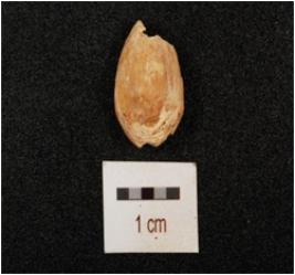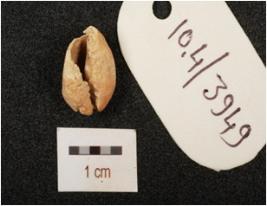 | Description / विवरण | Cowrie shell with natural grooves on damaged top and weathered surface, marine origin. |