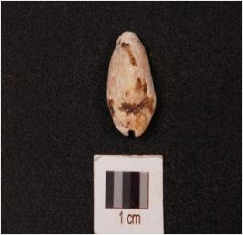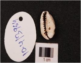 | Description / विवरण | A cowrie shell, natural marine object with groove powdery surface and white in colour. |