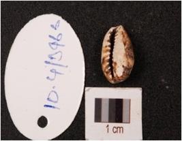 | Description / विवरण | A cowrie shell, natural white in colour, natural marine object and powdery surface. |