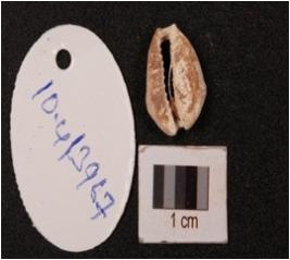 | Description / विवरण | A shell cowrie, natural marine object with groove on the surface and white in colour exterior surface is broken. |