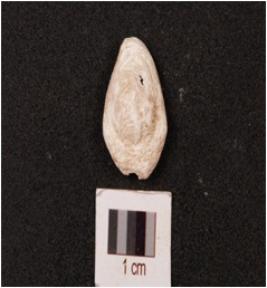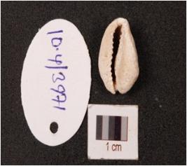 | Description / विवरण | A cowrie shell, natural marine object with groove powdery surface and white in colour. |
