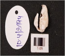 | Description / विवरण | A cowrie shell, natural marine object with groove powdery surface and white in colour. |