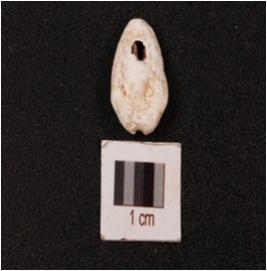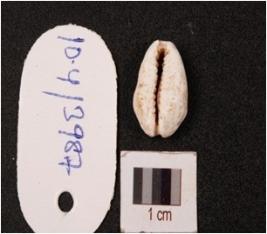 | Description / विवरण | A cowrie shell, natural marine object with groove, hole on surface, powdery surface and white in colour. |