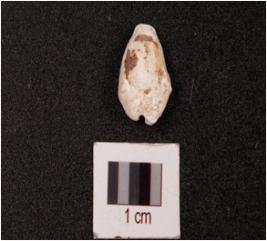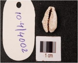 | Description / विवरण | A cowrie shell, natural marine object with natural groove, white in colour and powdery surface. |
