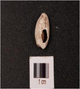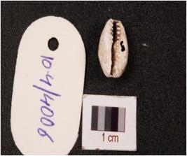 | Description / विवरण | A cowrie shell, natural marine object with groove, black pigments on surface and damage on exterior surface. |