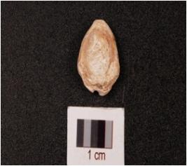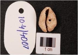 | Description / विवरण | A cowrie shell, a natural marine object with natural groove, off white in colour, hole on interior surface and powdery surface. |