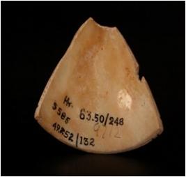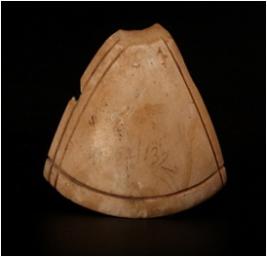 | Description / विवरण | Fragment of shell protector made from body of a conch shell. Grooved design in upper portion. Glossy inner surface and partly broken. |