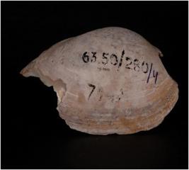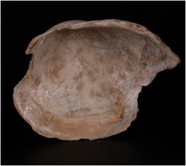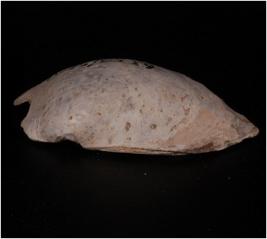 | Description / विवरण | Fragment of shell muscle with natural lines and a small natural projection-like mark on convex shaped top portion. Oval in shape, smooth eroded surface on both sides. |