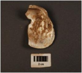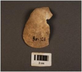 | Description / विवरण | Fragment of a marine shell. Natural lines on surface and glossy and concave interior with perforation. |