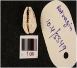 | Description / विवरण | A natural shell cowrie with bulbous top groove on bottom and powdery surface. |