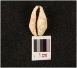 | Description / विवरण | A natural shell cowrie with a bulbous top, damaged exterior side and powdery surface. |
