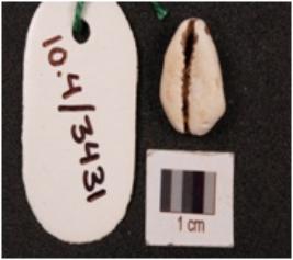 | Description / विवरण | Cowrie shell with a natural groove and powdery surface. |